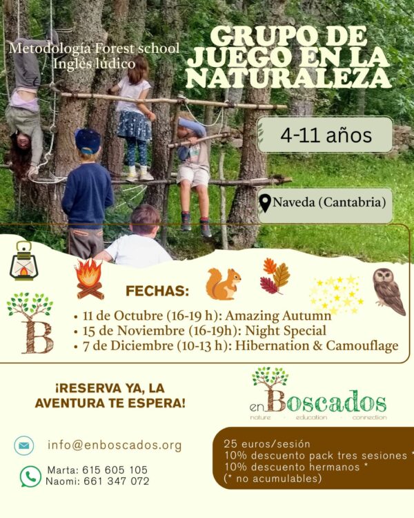 El Grupo de Juego en la Naturaleza para niños/as de 4 a 11 años tiene lugar un sábado o domingo al mes en horario de tarde (de 16h a 19 h) o de mañana (de 10 a 13 h) en nuestra finca en el bosque de Naveda (Campoo de Suso).